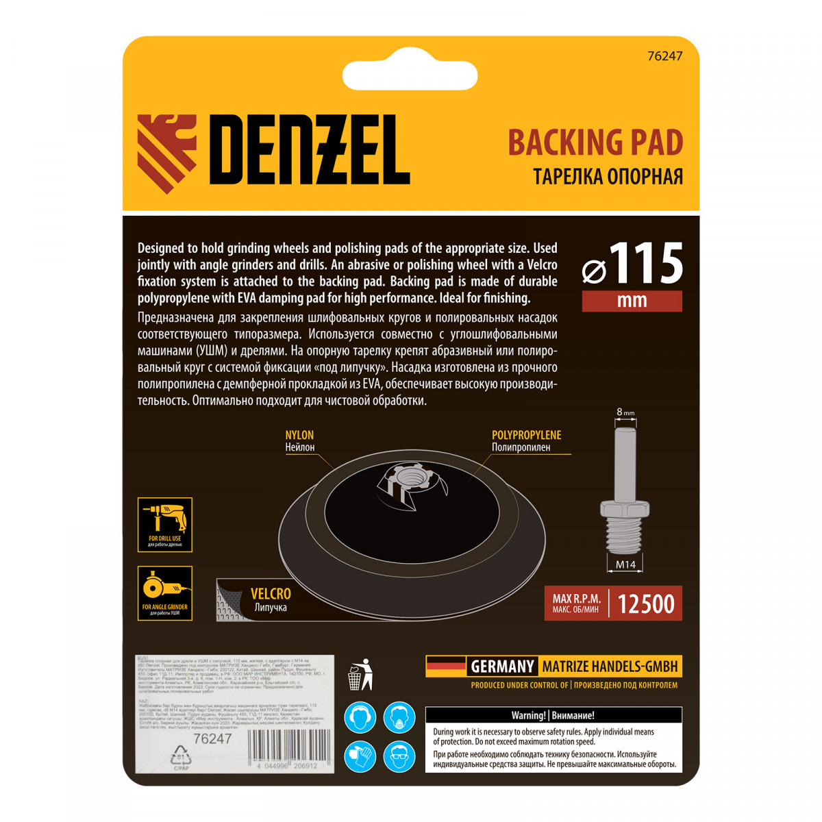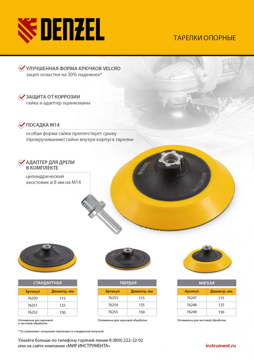 Тарелка опорная для дрели и УШМ с липучкой, 115 мм, мягкая, с адаптером c М14 на d8 Denzel