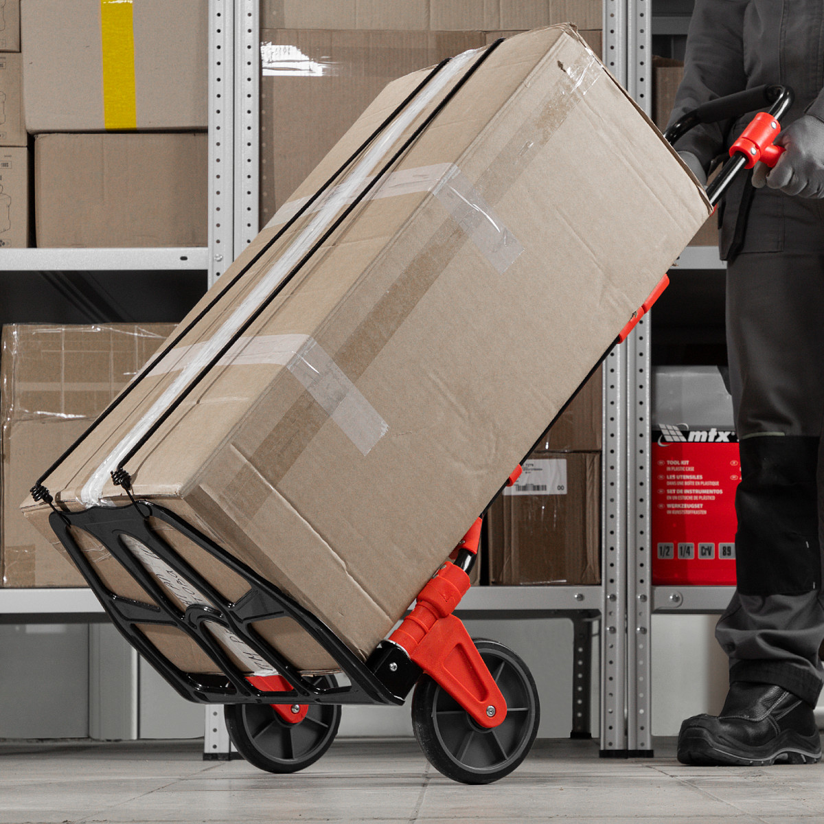 - Удобное хранение и транспортировка — платформа и колеса складываются, поэтому тележка не занимает много места.