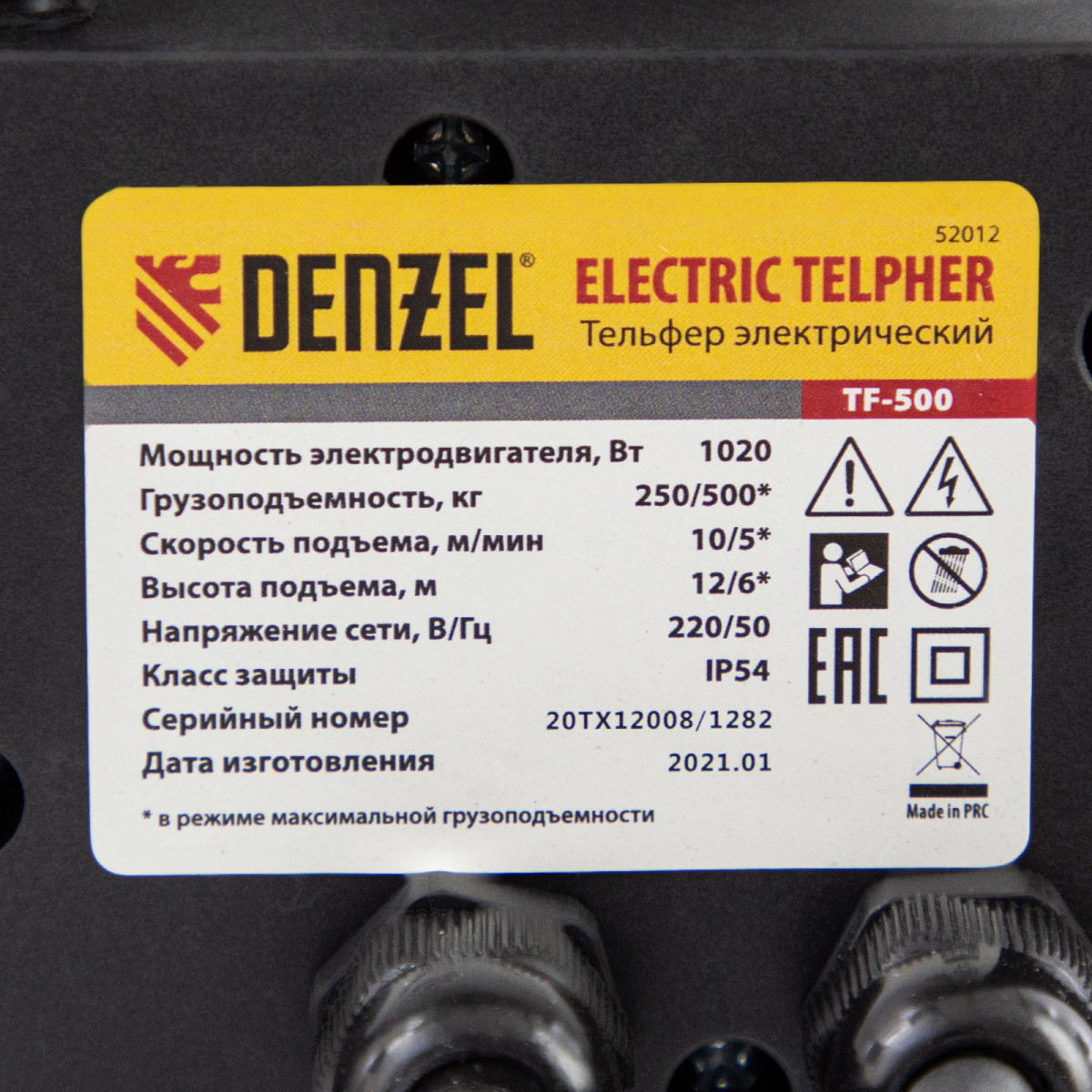 Тельфер электрический TF-500, 0.5 т, 1020 Вт, высота 12 м, 10 м/мин Denzel