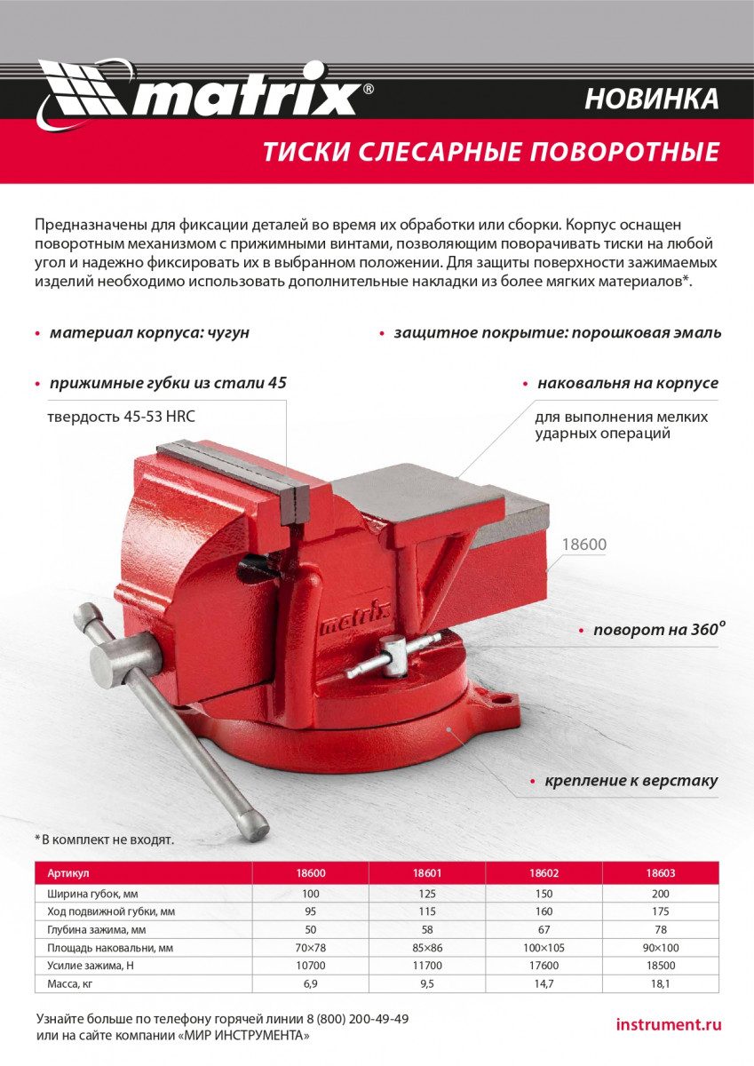 Поворотные слесарные тиски Matrix 18602 с наковальней и губками шириной 150 мм имеют рабочий ход 160 мм и предназначены для захвата и фиксации различных деталей. Поворотный механизм с прижимными винтами позволяет вращать тиски на 360° и фиксировать их в выбранном положении для удобной обработки заготовок с разных сторон. Инструмент используется для шлифовки, сверления и проведения других работ. Будет полезен в мастерской и гараже.
