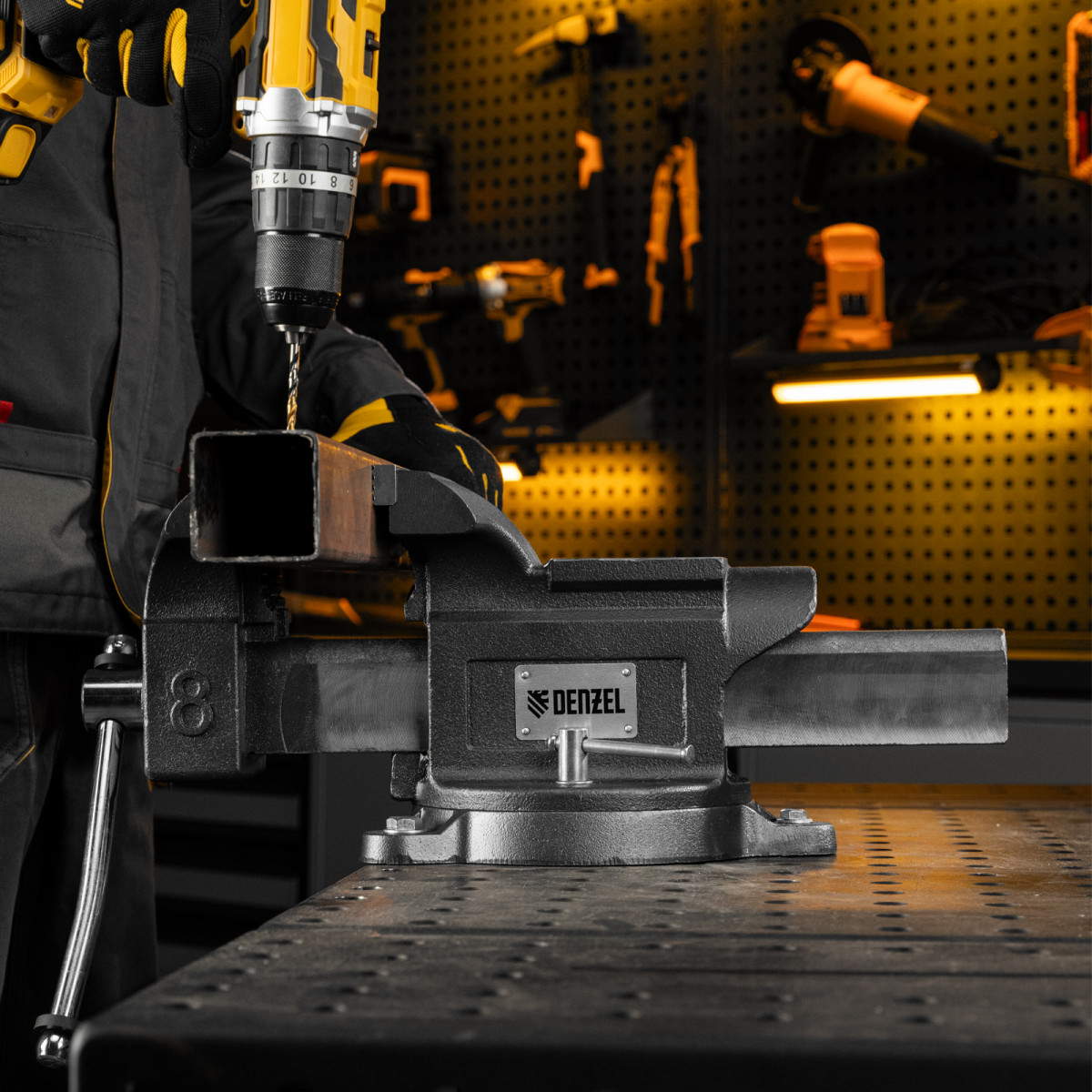 Тиски слесарные BVH-200, 200 мм, поворотные, стальная направляющая, с наковальней //Denzel