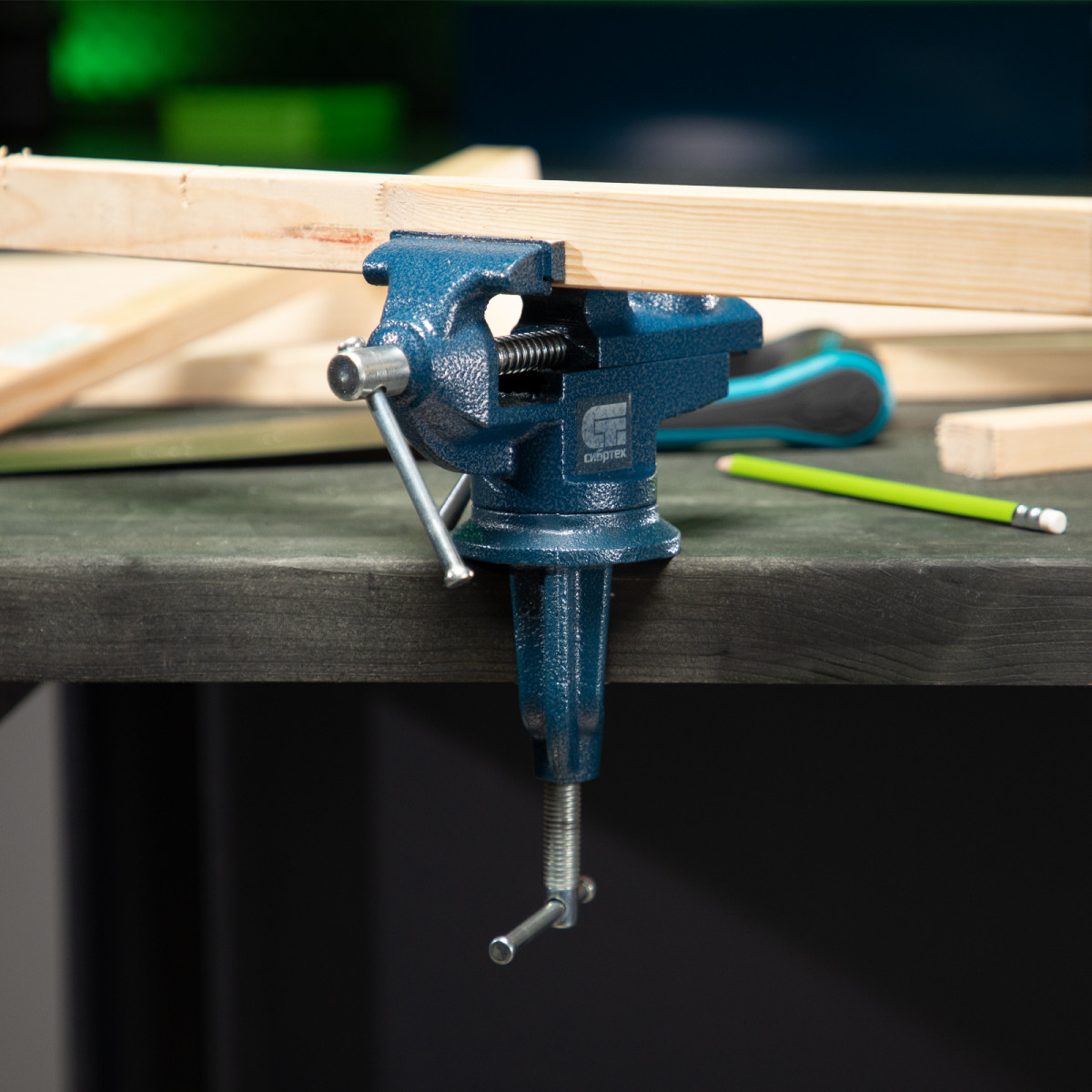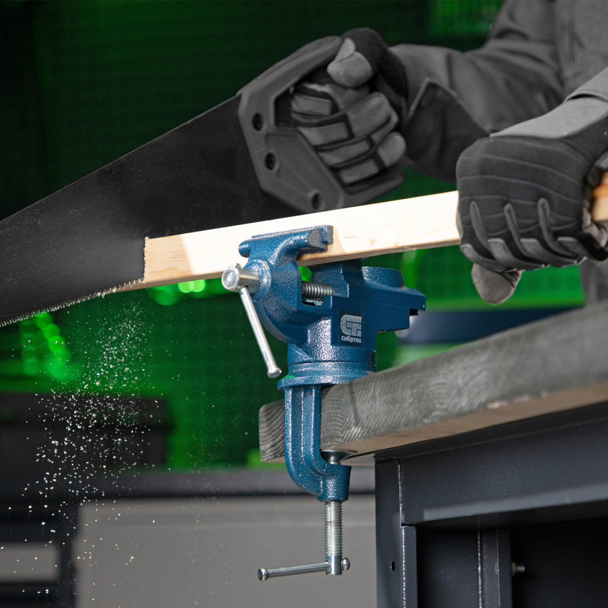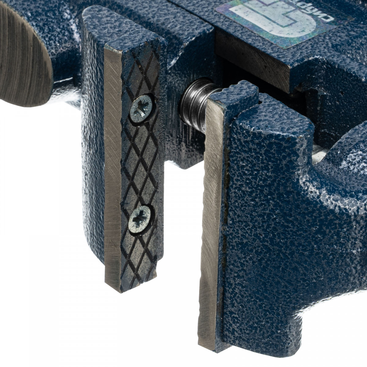 • Винтовой зажим позволяет быстро устанавливать и снимать тиски, поэтому их можно использовать на различных рабочих местах.