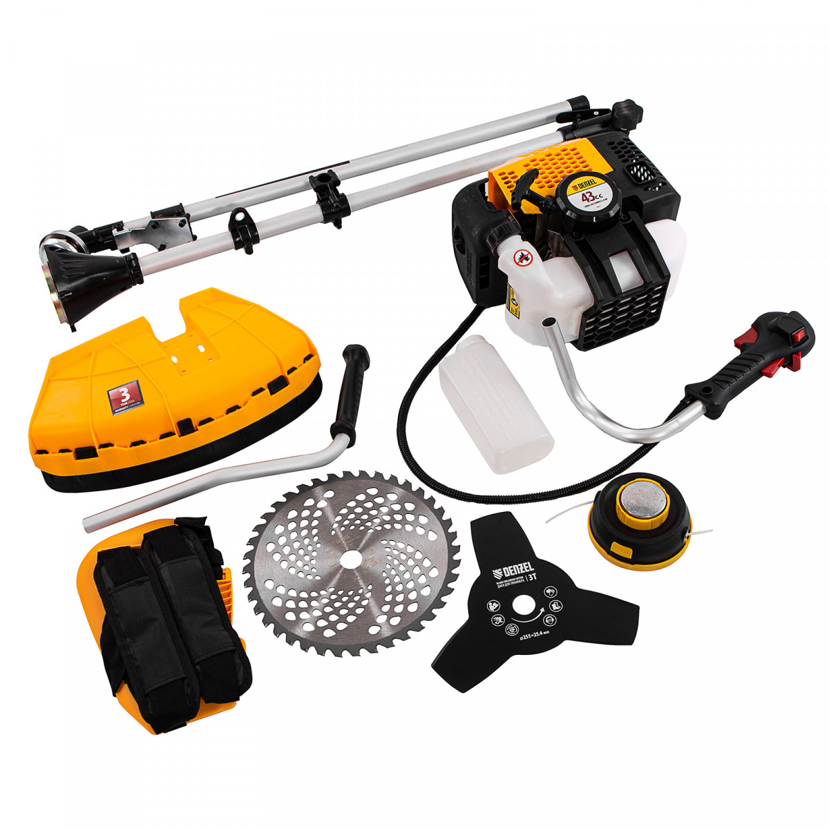Триммер бензиновый - 1 штКатушка - 1 штНож трехлопастной 3Т - 1 штПильный диск 40Т - 1 штДвухплечевая подвесная система с защитой бедра - 1 штДозатор для приготовления смеси - 1 штНабор крепежа - 1 штНабор инструментов - 1 штРуководство по эксплуатации с гарантийным талоном - 1 штДозатор для приготовления топливной смеси - 1 шт