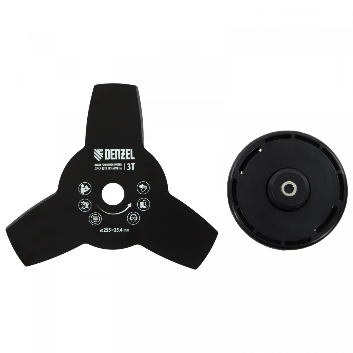 • Дополнительные возможности — можно приобрести диск Denzel 96323 с шириной скашивания 230 мм для быстрого удаления растительности с жесткими стеблями, 96328 для скашивания молодых побегов кустарника диаметром до 3 мм, 96340 для срезания борщевика, кустарника и молодых побегов деревьев с диаметром стволов до 10 мм.