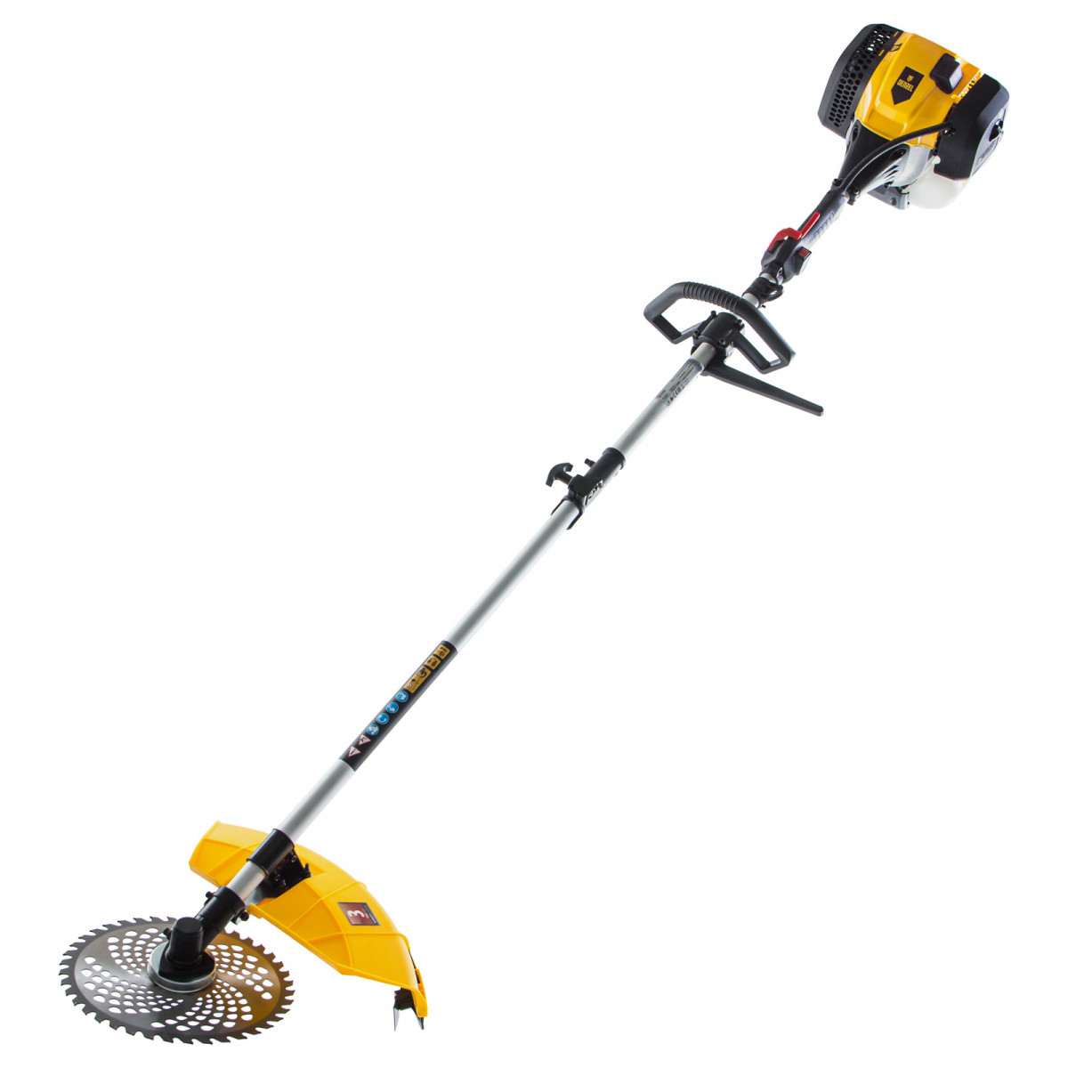 Триммер универсален по своему применению. Катушка с леской и нож позволяют ухаживать за газоном, скашивать траву с жесткими стеблями (полынь, крапиву, лебеду). Пильный диск легко справляется с жесткими древовидными стеблями борщевика, а также с обрезкой кустарника и молодых побегов деревьев с диаметром стволов до 10 мм. Кусторез и высоторез пригодятся, чтобы придать форму декоративным кустам, создать живую изгородь и обрезать крупные ветки деревьев. Мощный двигатель на 3 л.с. и частота вращения оснастки 9500 об/мин позволяют эффективно бороться с растительностью — за час можно обработать участок площадью до 20 соток.