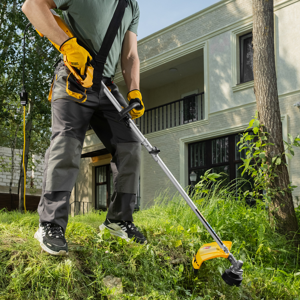 • Снижение нагрузки на спину — наплечный ремень равномерно распределяет вес садового электротриммера, что уменьшает усталость при длительной работе.