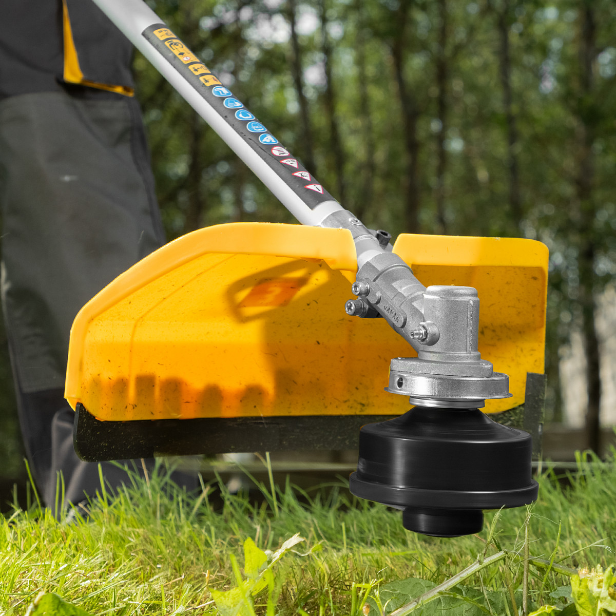 • Безопасность — блокировка выключателя препятствует случайному запуску, а защитный кожух предохраняет от летящей травы.