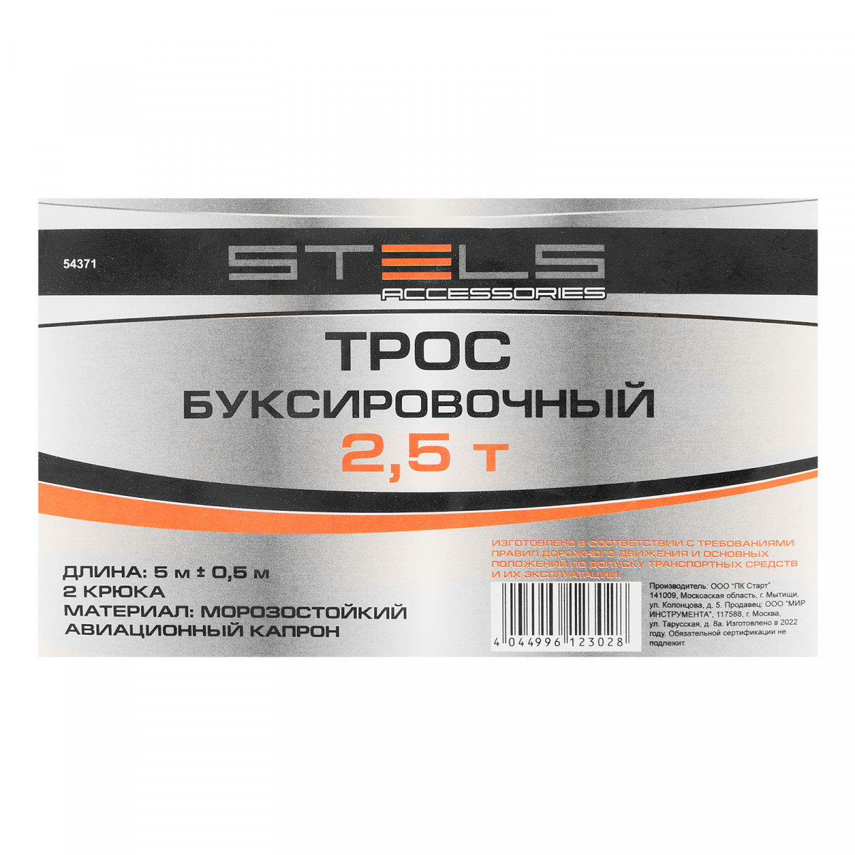 Трос буксировочный Stels 54371 с 2 крюками, в пакете, выдерживает нагрузки до 2,5 тонн. Будет полезен водителям при поломке легковых автомобилей, проблемах с двигателем, вытягивании транспортного средства из кювета, грязи и т.д.
