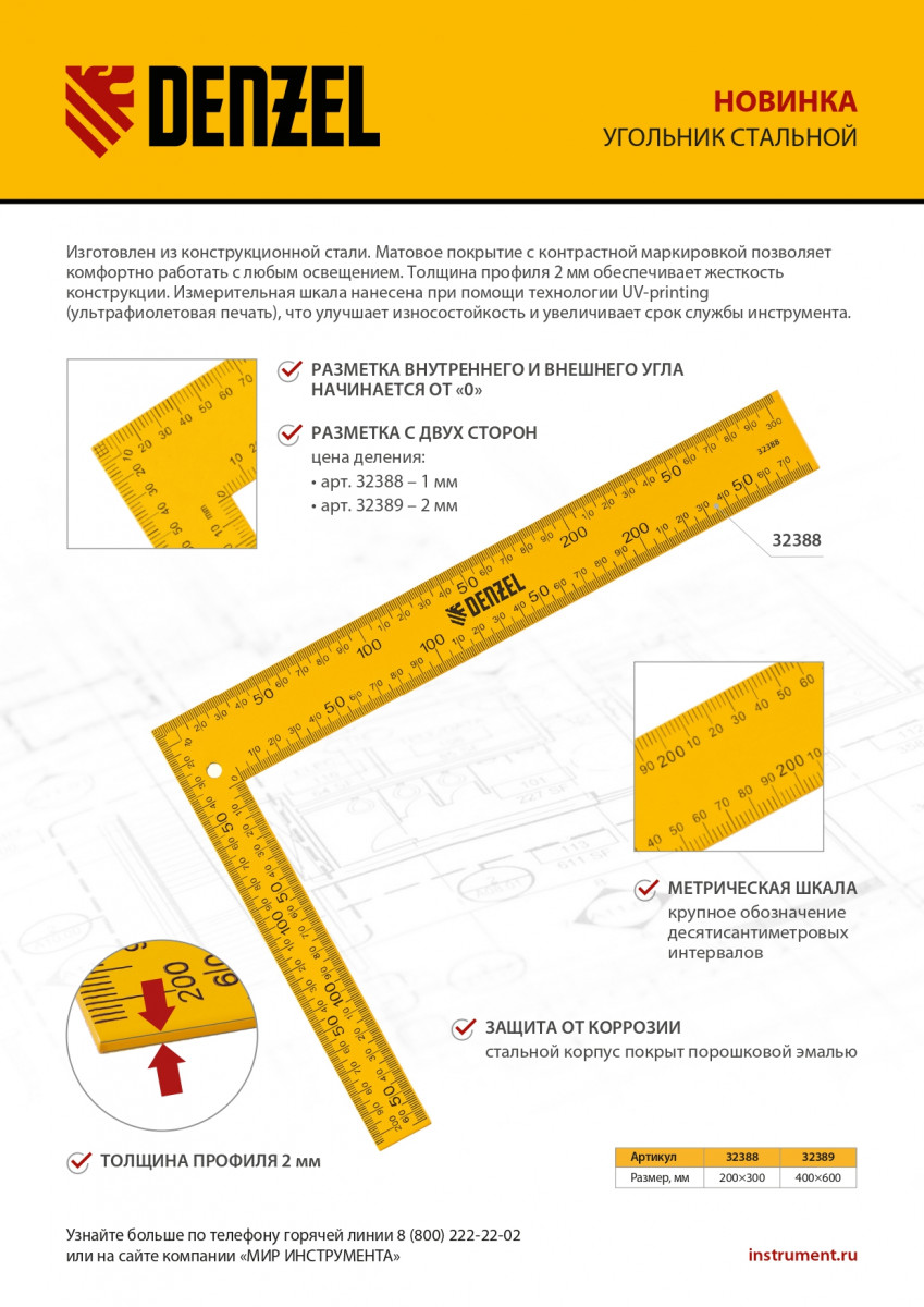 Угольник Denzel обладает износостойкой шкалой благодаря ультрафиолетовой печати.