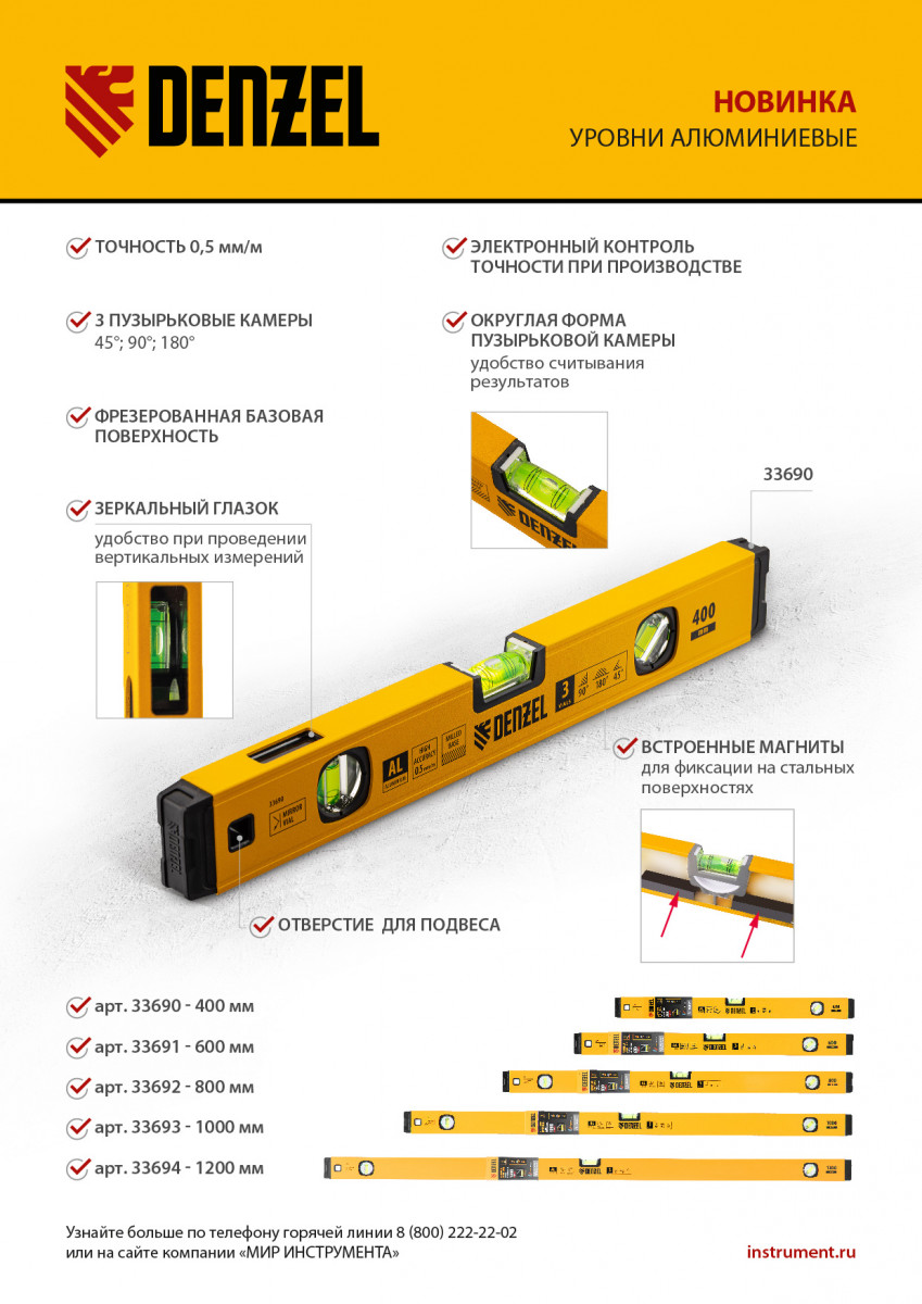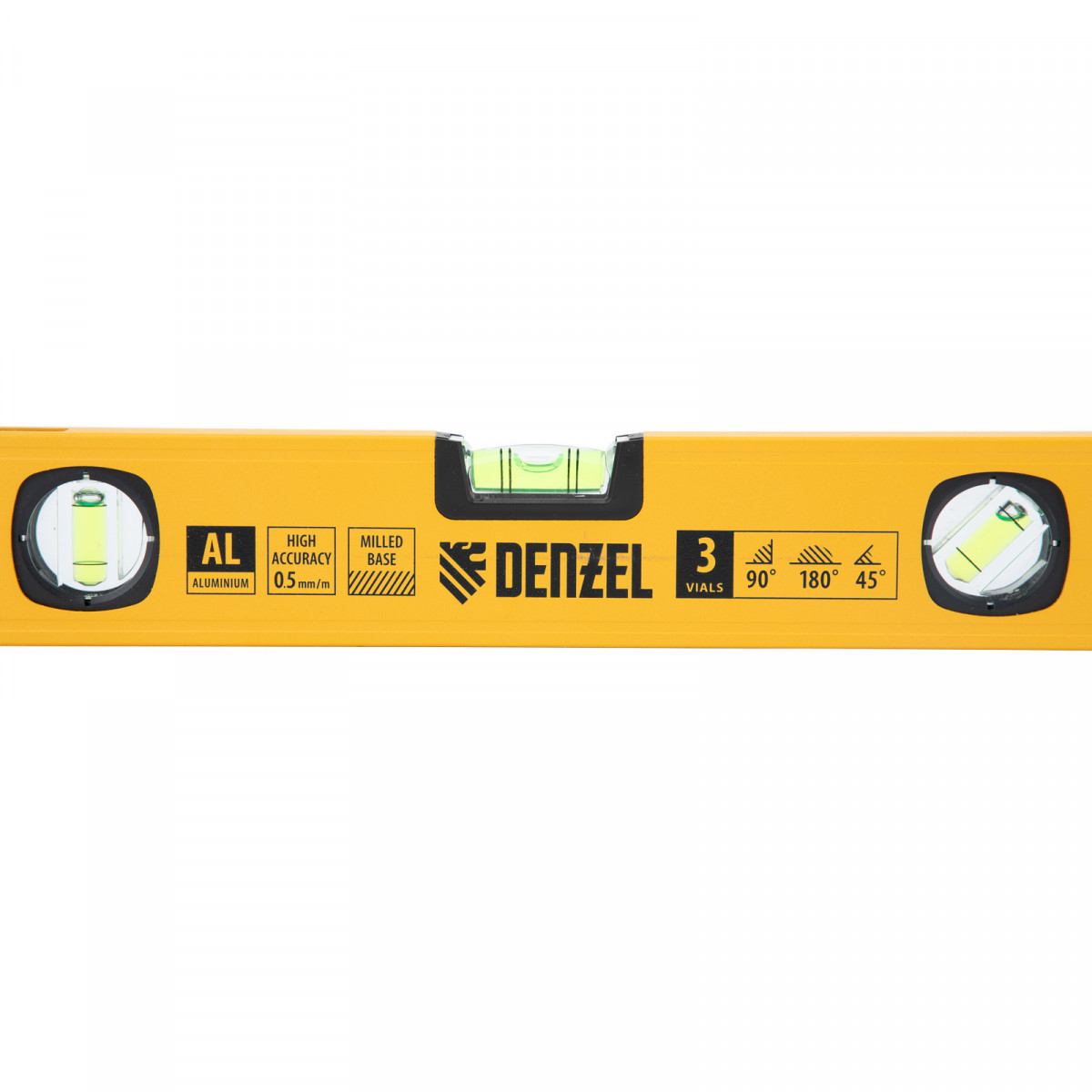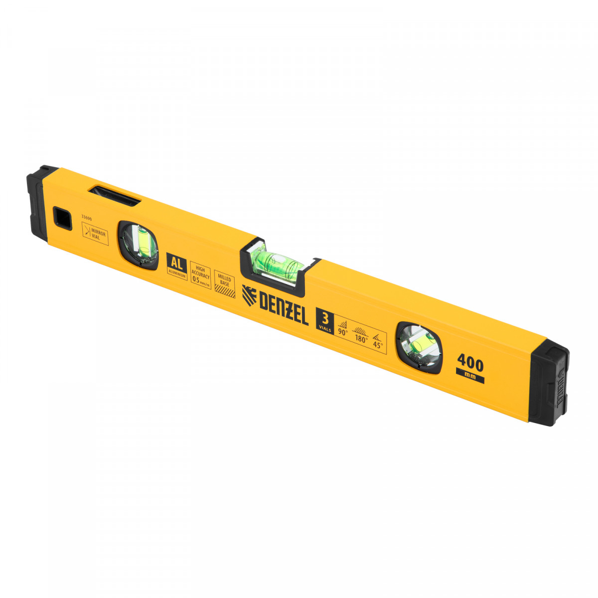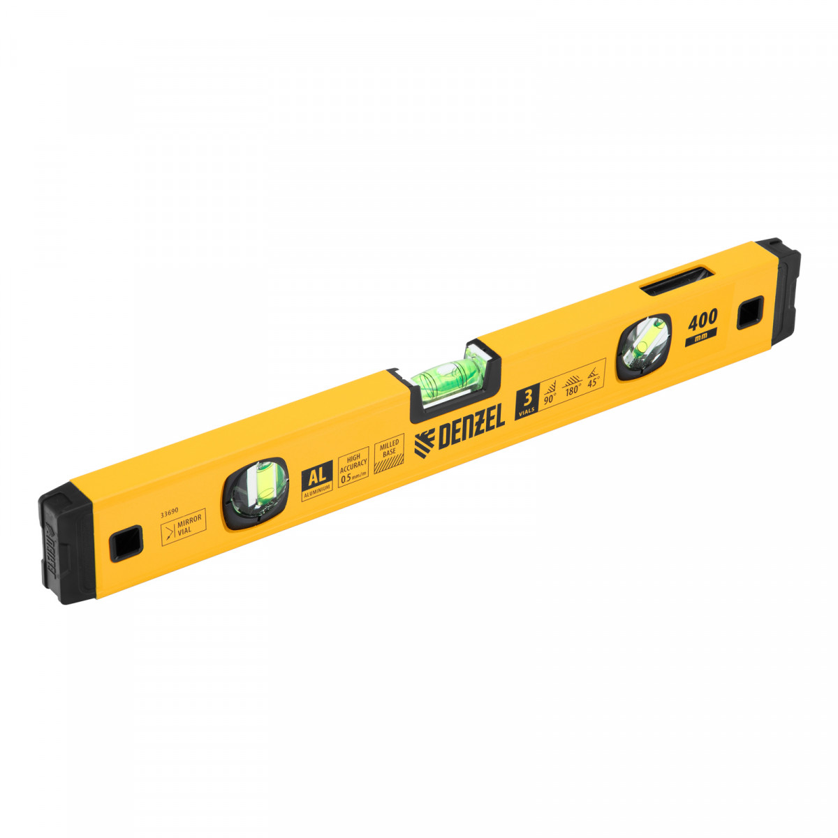 Уровень алюминиевый, магнит., фрезерованный, 3 глазка (1 зеркал.) 0,5 мм/м, 400 мм Denzel