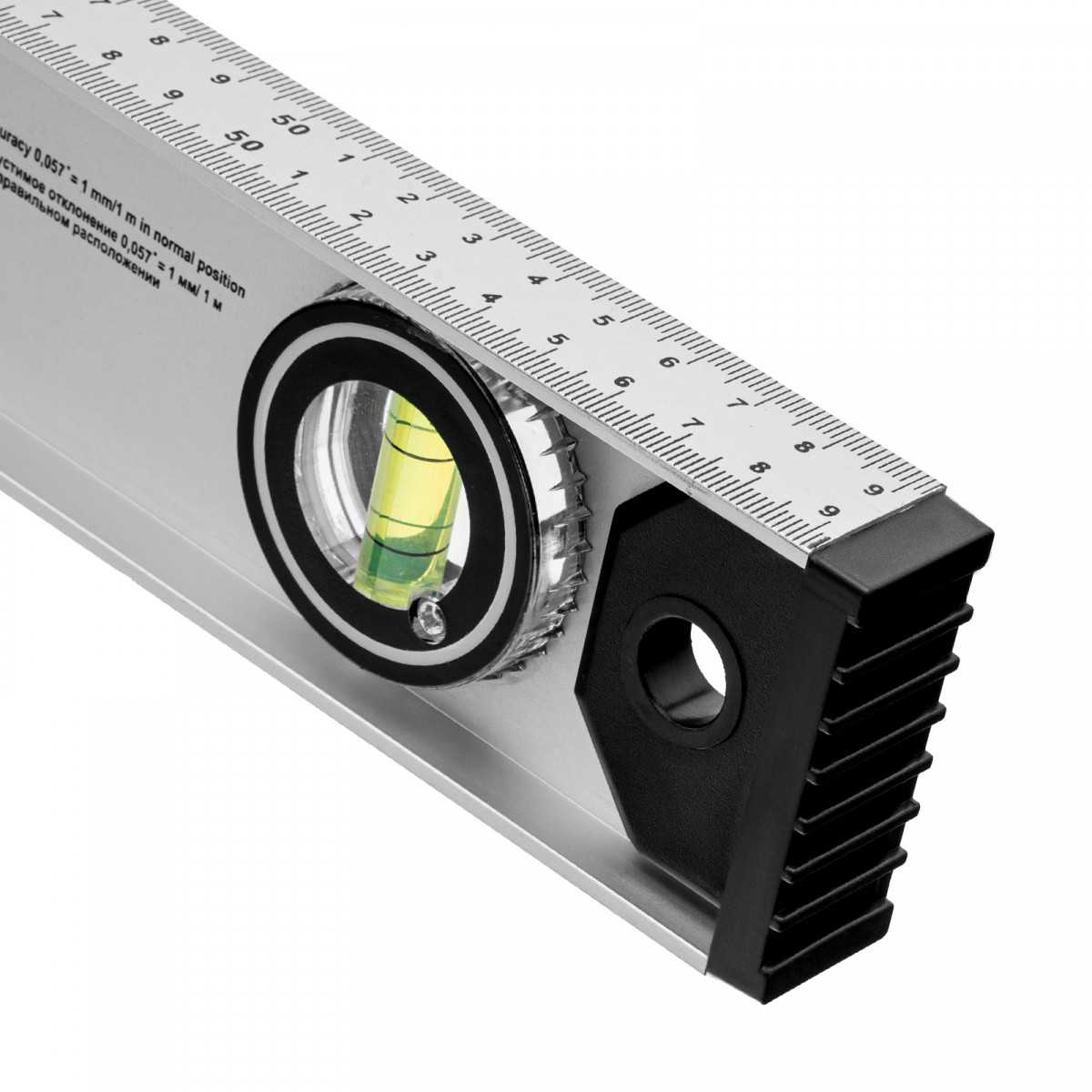 Алюминиевый уровень Matrix «Рельс» 34023 длиной 600 мм имеет 3 глазка: 2 для проверки отклонений от заданной вертикали и горизонтали и 1 поворотный для проверки наклонных поверхностей.