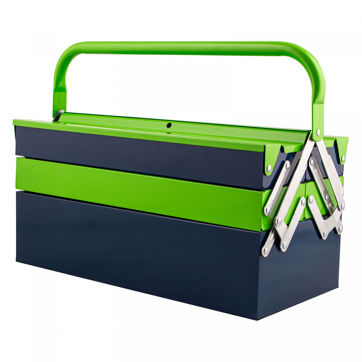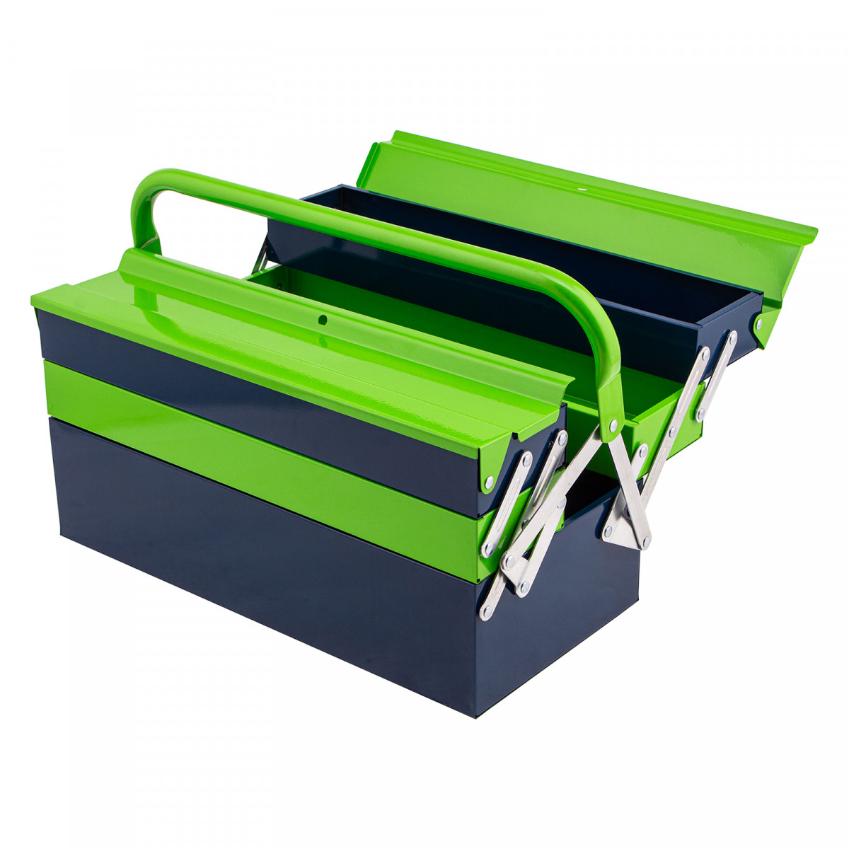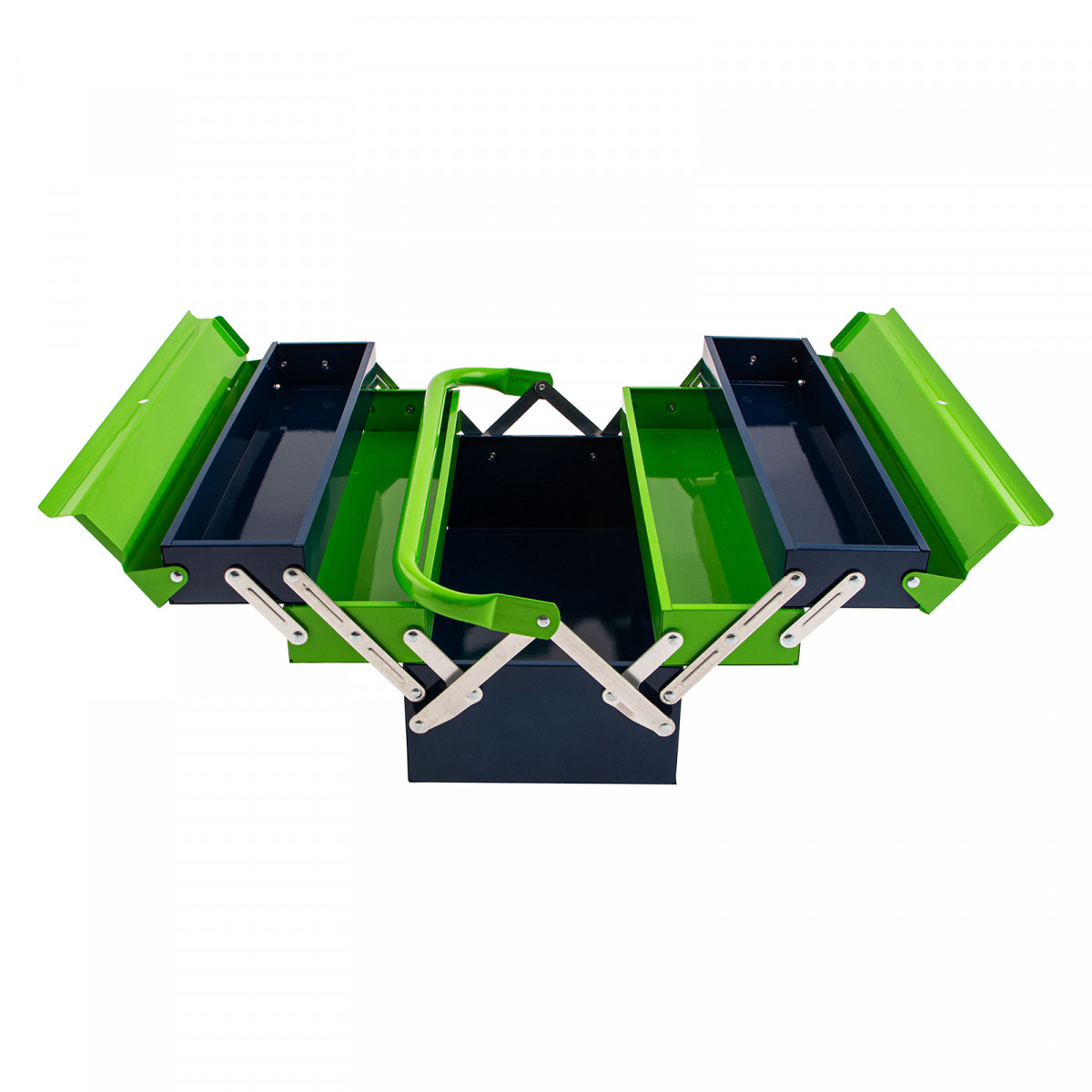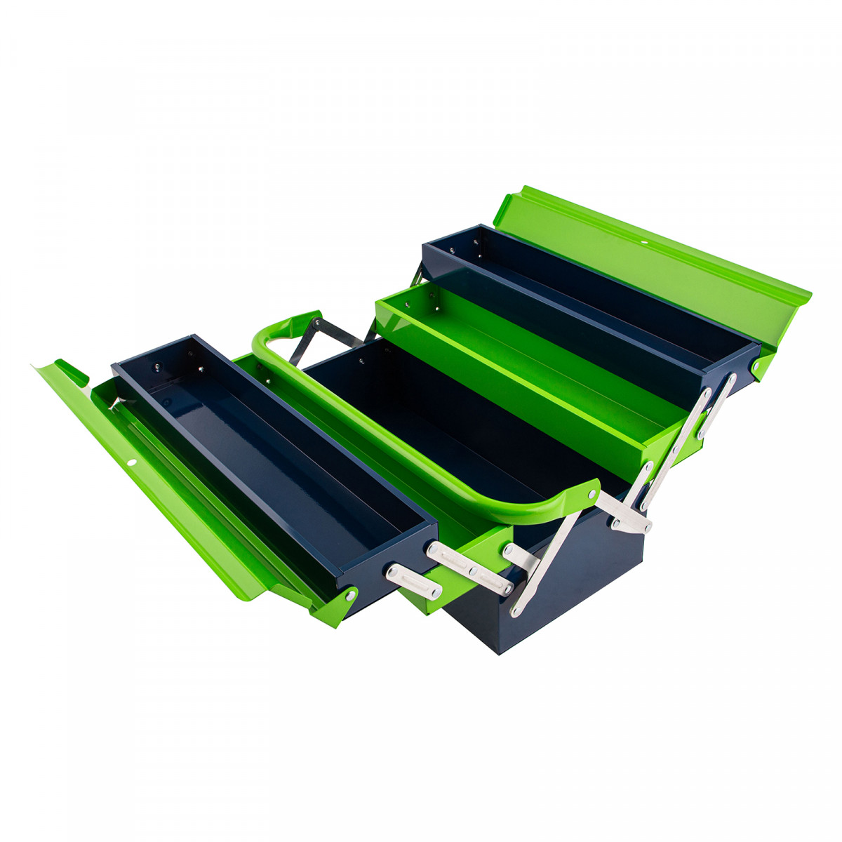 - Удобное использование — ящик легко раскладывается, ручка поворачивается и не мешает размещать или извлекать инструменты.
