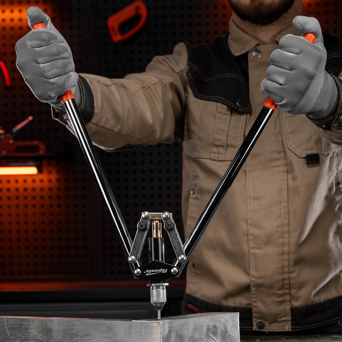 Двуручный усиленный заклепочник Sparta 405385 длиной 450 мм используется для скрепления металлических листов с помощью заклепок 3,2-4,0-4,8 мм. Он обеспечивает высокую производительность работы, т.к. требует меньше усилий от мастера в сравнении с одноручным инструментом. Благодаря усиленной конструкции инструмент рассчитан на высокие нагрузки.