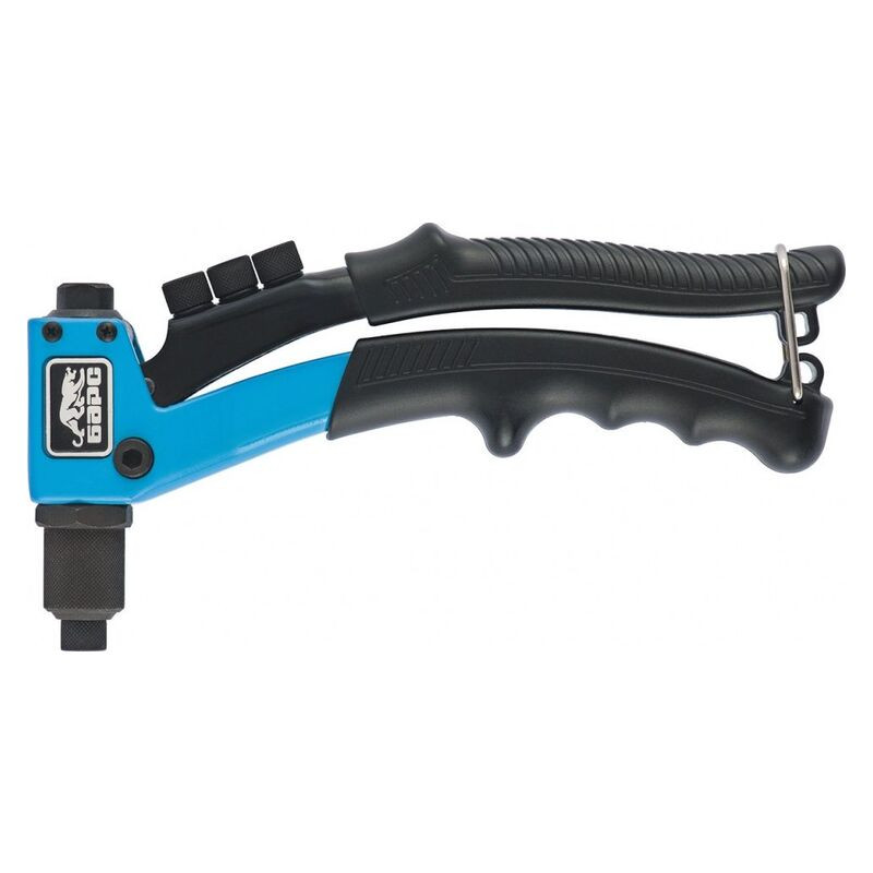 Заклепочник 200 мм, алюминий 2,4-4,8 мм, сталь 2,4-4 мм Барс. Заклепочник предназначен для соединения листового металла, различных тонкостенных конструкций и металлических профилей. Трехсегментный цанговый зажим предотвращает перекос вытяжной шпильки и обеспечивает ее надежную фиксацию. Цанговый механизм изготовлен из прочной хромомолибденовой стали. Инструмент укомплектован насадками для работ с заклепками четырех диаметров 2,4-3,2-4,0-4,8 мм. Длина инструмента 200 мм. Корпус заклепочника изготовлен из алюминиевого сплава ADC12, отлитого под высоким давлением. Эргономичные рукоятки облегчают процесс работы.