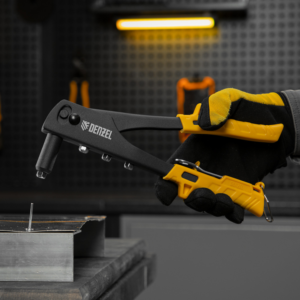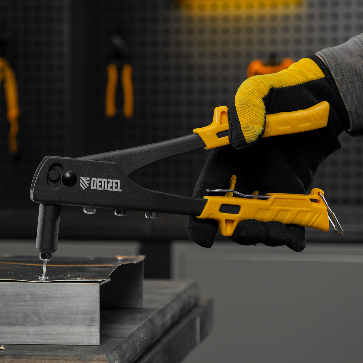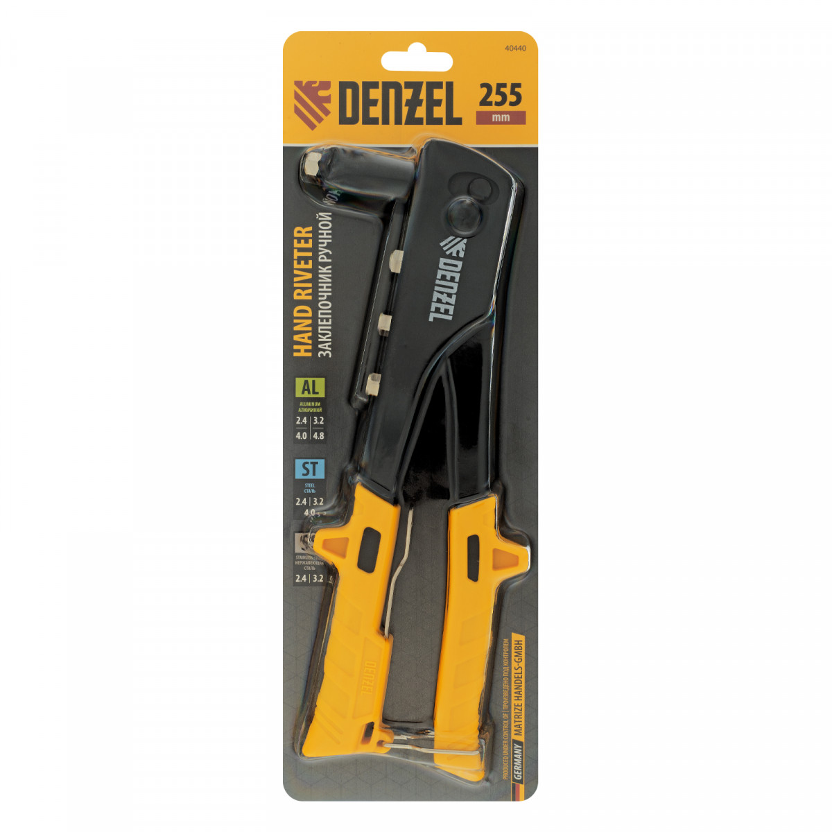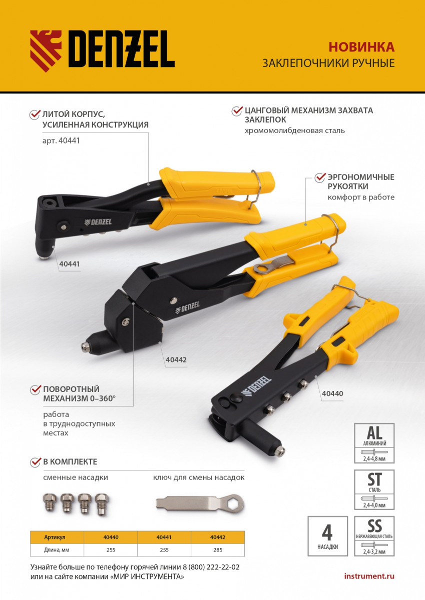 Ручной заклепочник Denzel 40440 длиной 255 мм предназначен для работы с алюминиевыми вытяжными заклепками диаметром 2,4-3,2-4,0-4,8 мм, стальными диаметром 2,4-3,2-4,0 мм и вытяжными заклепками из «нержавейки» диаметром 2,4-3,2 мм. Инструмент позволяет соединять листовые металлические заготовки, металлопрофиль и легкие конструкции небольшой толщины. Используется для проведения строительных, ремонтных и монтажных работ как в быту, так и в профессиональной сфере.