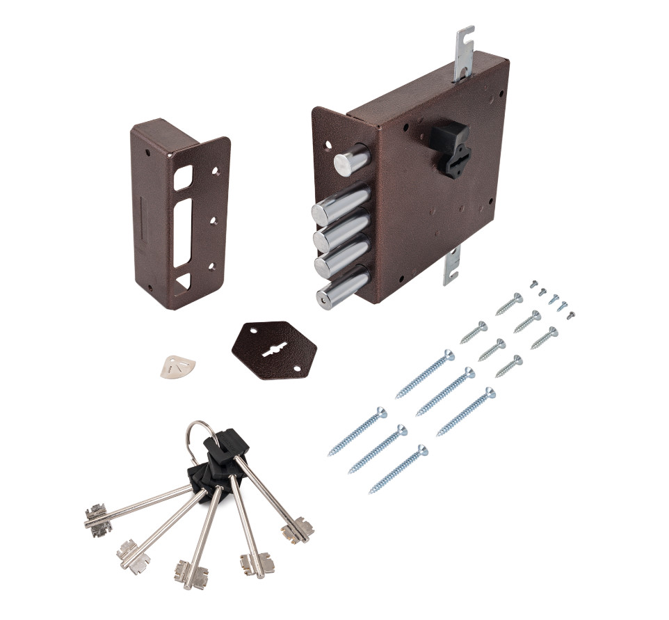 Замок имеет возможность подключения тяг и рекомендуется для установки в металлические двери подъездов, гаражей, ангаров и других помещений.