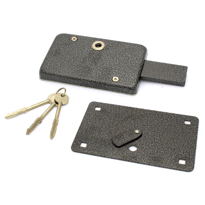 Замок накладной, цилиндровый под крест.ключ, для установки на металлические двери. Засов из прямоугольного ригеля размерами (ширина-высота) 12-40 мм, с максимальным вылетом 75 мм. Удаление ключевого отверстия - 90 мм. Габариты замка -255x110x85. Комплектация - 3 крестовых ключа, внешняя накладка, закрывающая весь корпус замка.
