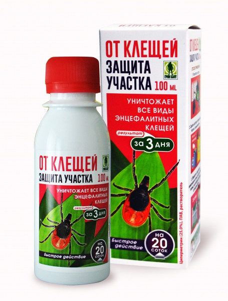 Уничтожает все виды энцефалитных (иксодовых) клещей. Защищает участок от переносчиков опасных заболеваний. Быстрое действие – результат за 3 дня. Флакон 100 мл рассчитан на обработку 20 соток.